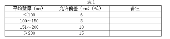 1 尺寸及公差要收,鋼錠模鑄件的尺寸及公差應(yīng)符合圖紙?jiān)O(shè)計(jì)規(guī)定。兩對(duì)稱吊耳橫向軸線允許偏差不大于30mm。吊耳上及錠模上吊耳附近不允許有可能影響強(qiáng)度的缺陷存在。 同一截面上之差應(yīng)符合表1要求。