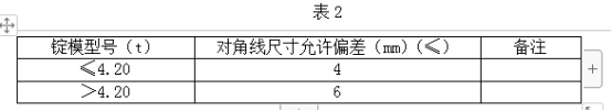 2.錠模內(nèi)上、下對(duì)應(yīng)部位尺寸偏差只能同為正偏差或負(fù)偏差。錠模內(nèi)腔橫斷面上不同對(duì)角線尺寸偏差大值應(yīng)符合表2規(guī)定。