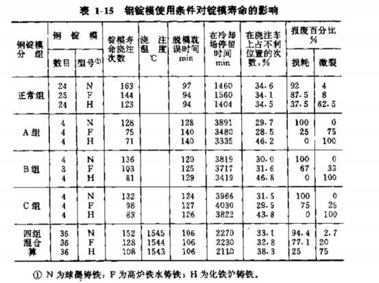 影響 鋼錠模 使用壽命的因素國內(nèi)外許多工廠對 鋼錠模 使用條件的研究指出:澆注方法、澆注溫度、澆注速度、脫模時間、冷卻方式及鋼錠模周轉(zhuǎn)都對鋼錠模壽命有直接的影響,其中尤以脫模時間及冷卻方式影響 _ 大。法國盧森堡阿爾貝德公司埃一舍夫朗日廠與比利時冶金研究中心共同合作研究鋼錠模使用條件對其壽命的影響,試驗把 108 個鋼錠模分為 4 組,每周澆注 6 次列為正常組,其他每周澆注 3 次的分為 A 、 B 、 C 三組,其試驗結(jié)果列于表 1 一 15 中。